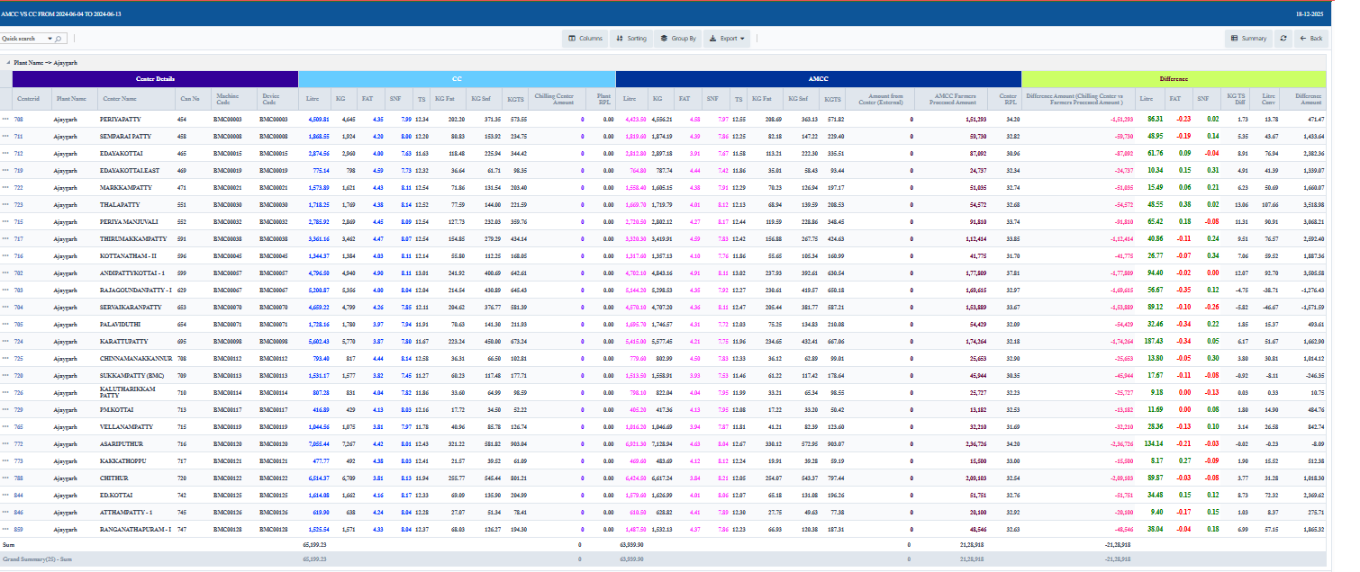 EasydairyERP Procurement AMCC Vs Chilling Center Difference Date Wise