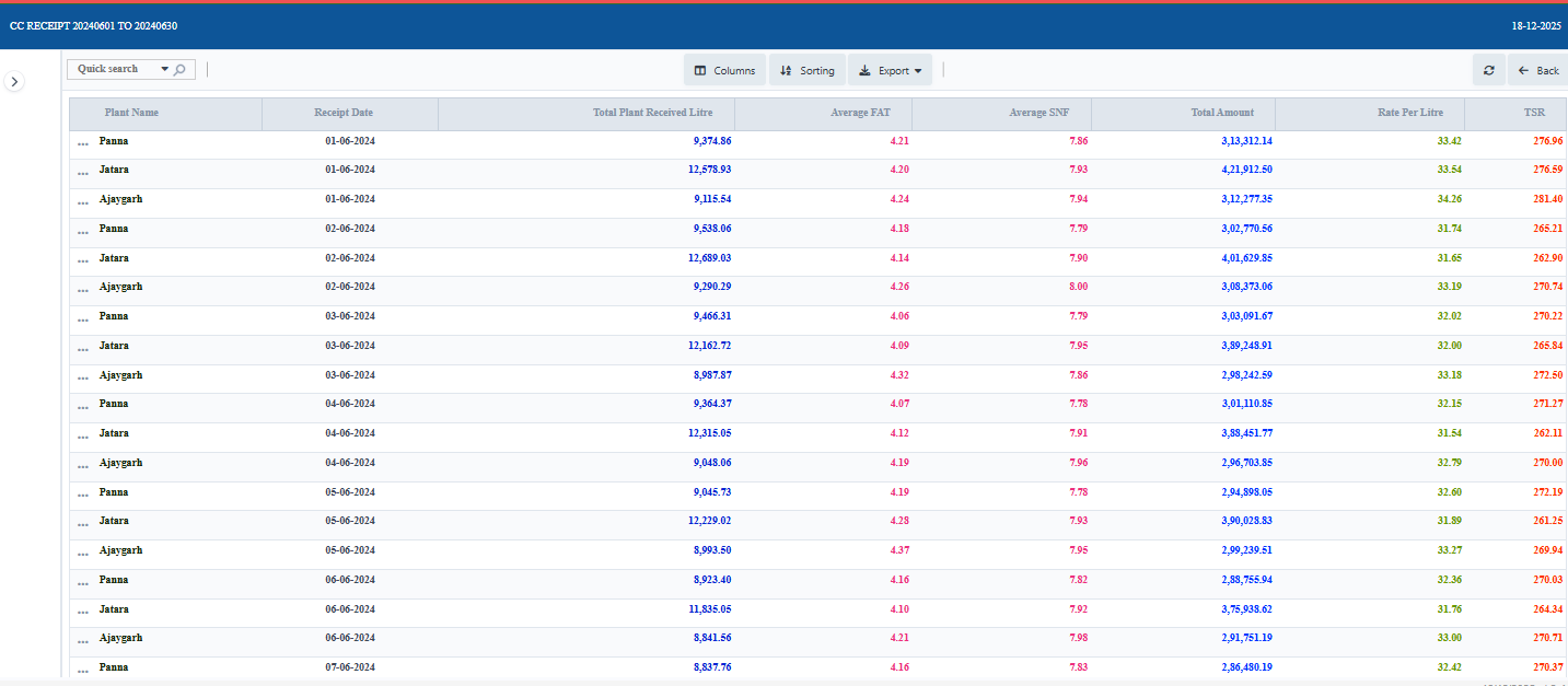 EasyDairyERP Procurement Daywise CC Receipt With Amount Report