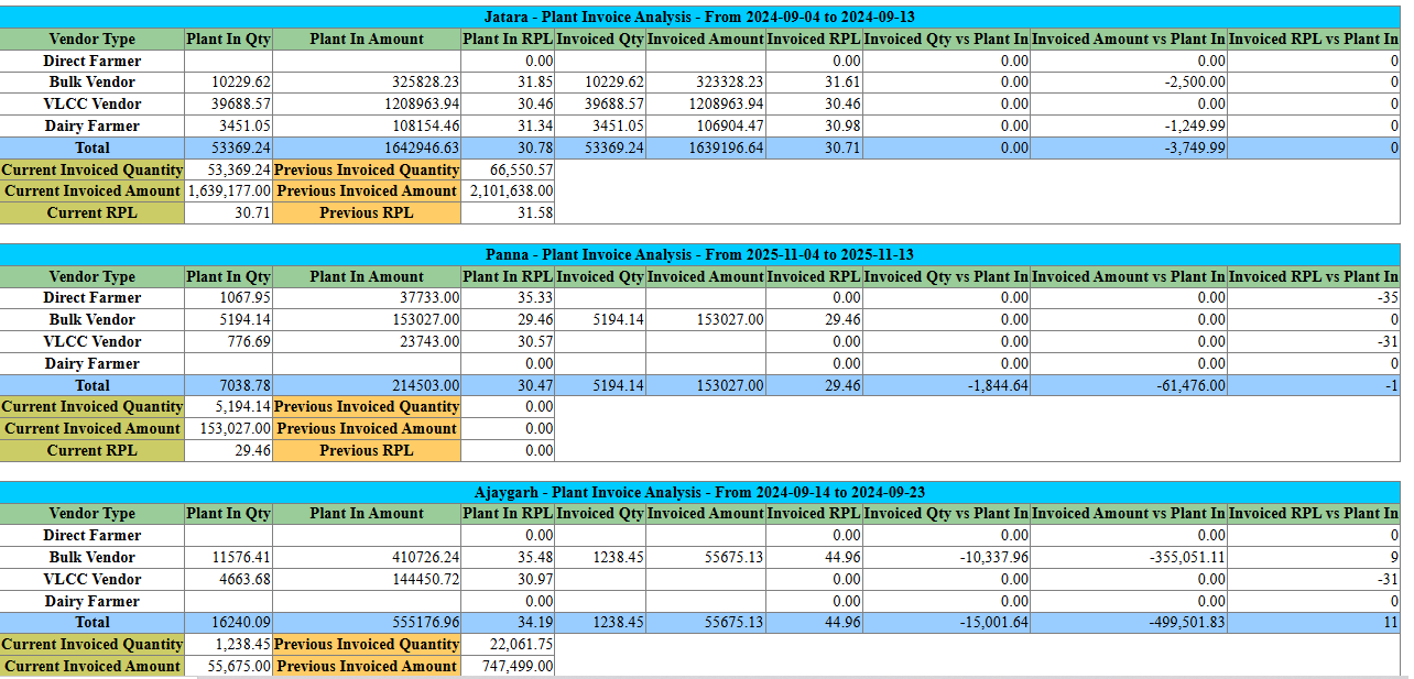 EasyDairyERP Procurement Plant Invoice Analysis Report