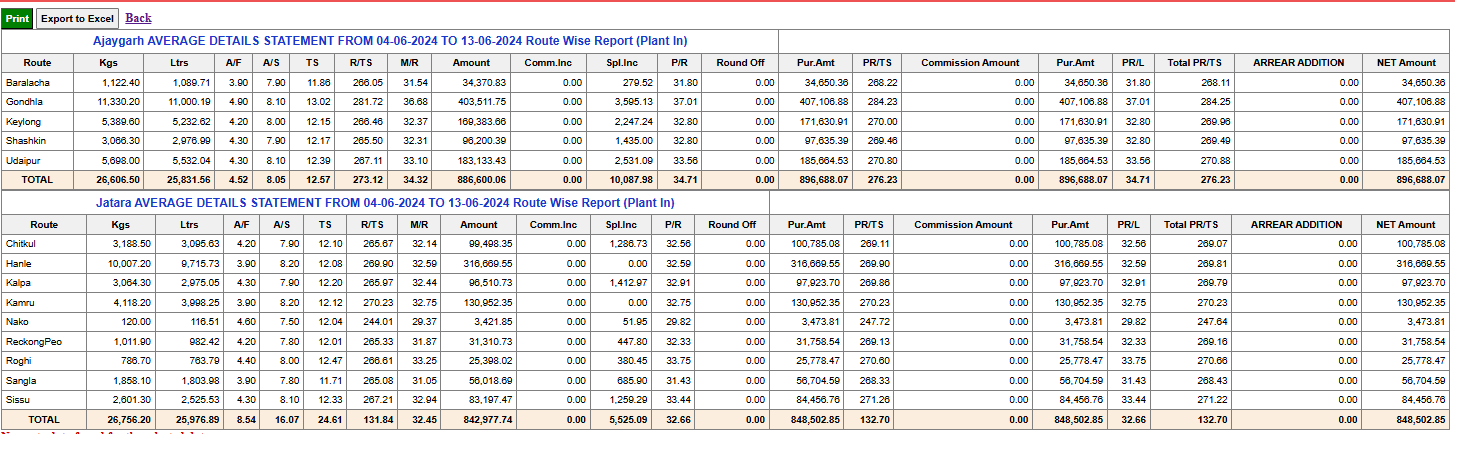 EasyDairyERP Procurement Route Wise Average Statement Report